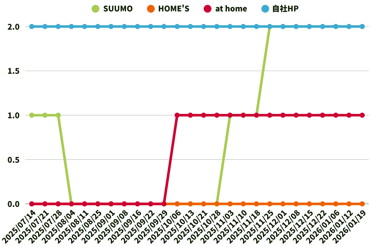 不動産会社からの問い合わせをもとに、レインズへの登録開始から売買契約完了時までに弊社が実際に目視にて確認した実際の広告掲載数をグラフにしております。