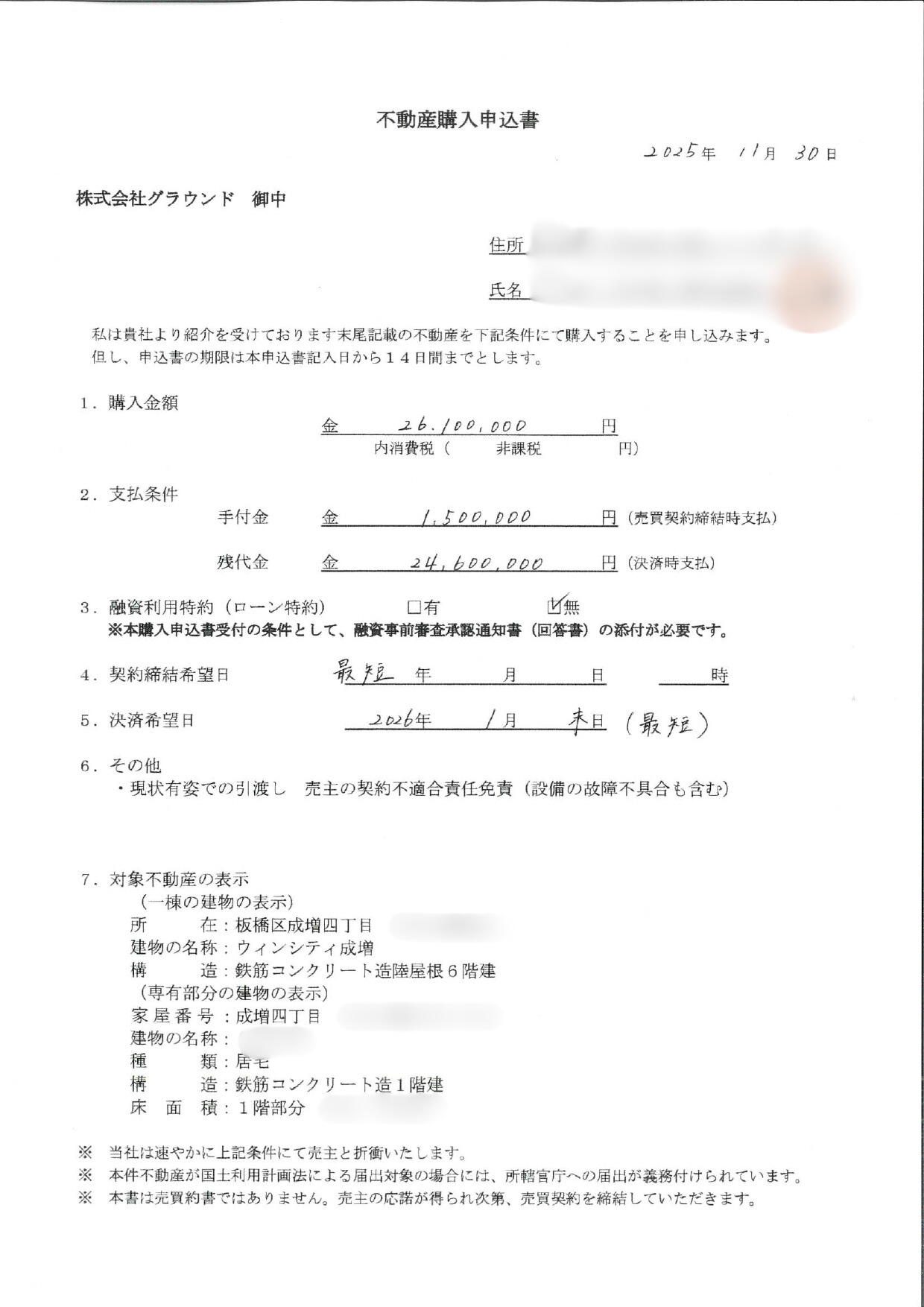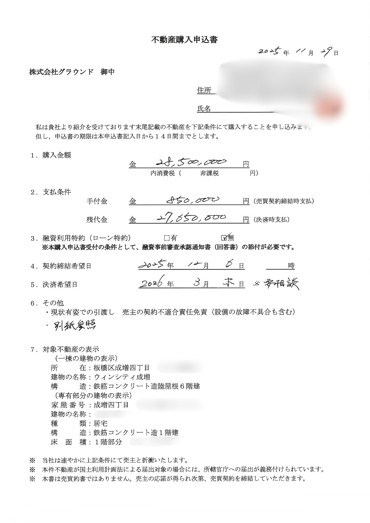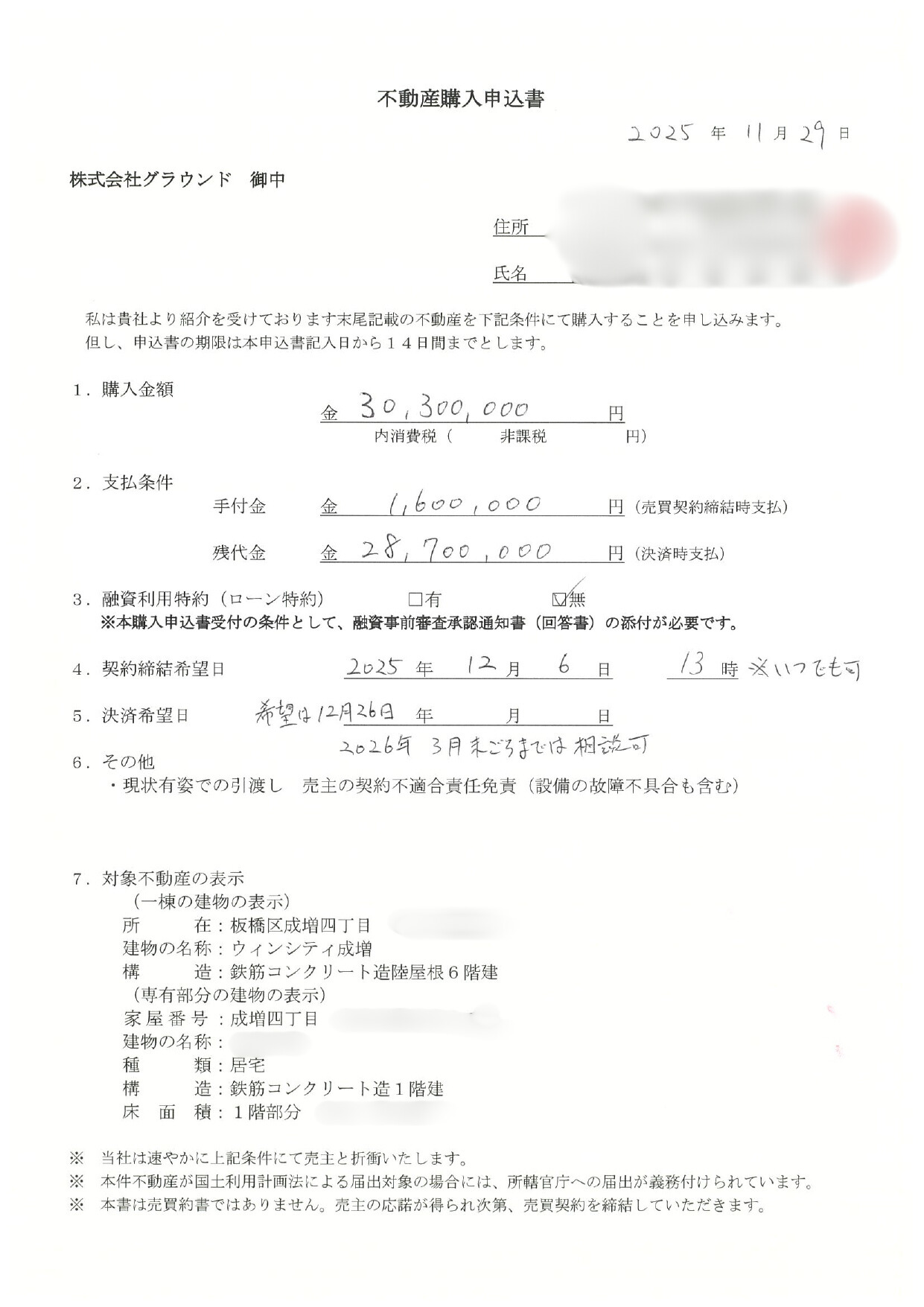 購入申込書受領日