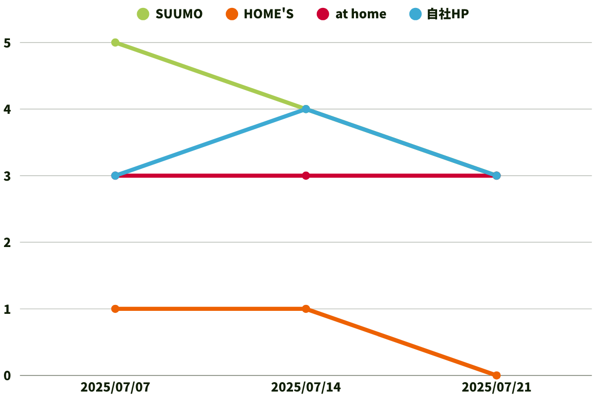 不動産会社からの問い合わせをもとに、レインズへの登録開始から売買契約完了時までに弊社が実際に目視にて確認した実際の広告掲載数をグラフにしております。