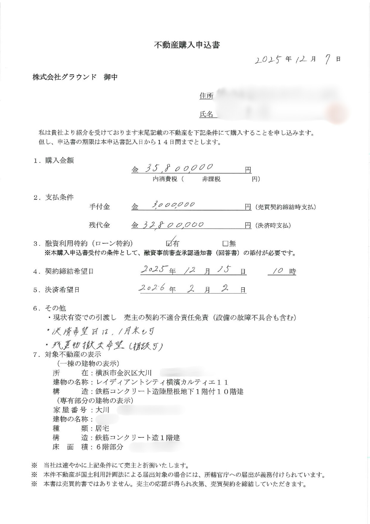 | 「契約不適合責任を負わない」という条件で売却の理由 | 特に大きな懸念点がある訳ではないですが、お引渡し後に細かい部分まで責任を負いたくないため、トラブルになりたくないため |