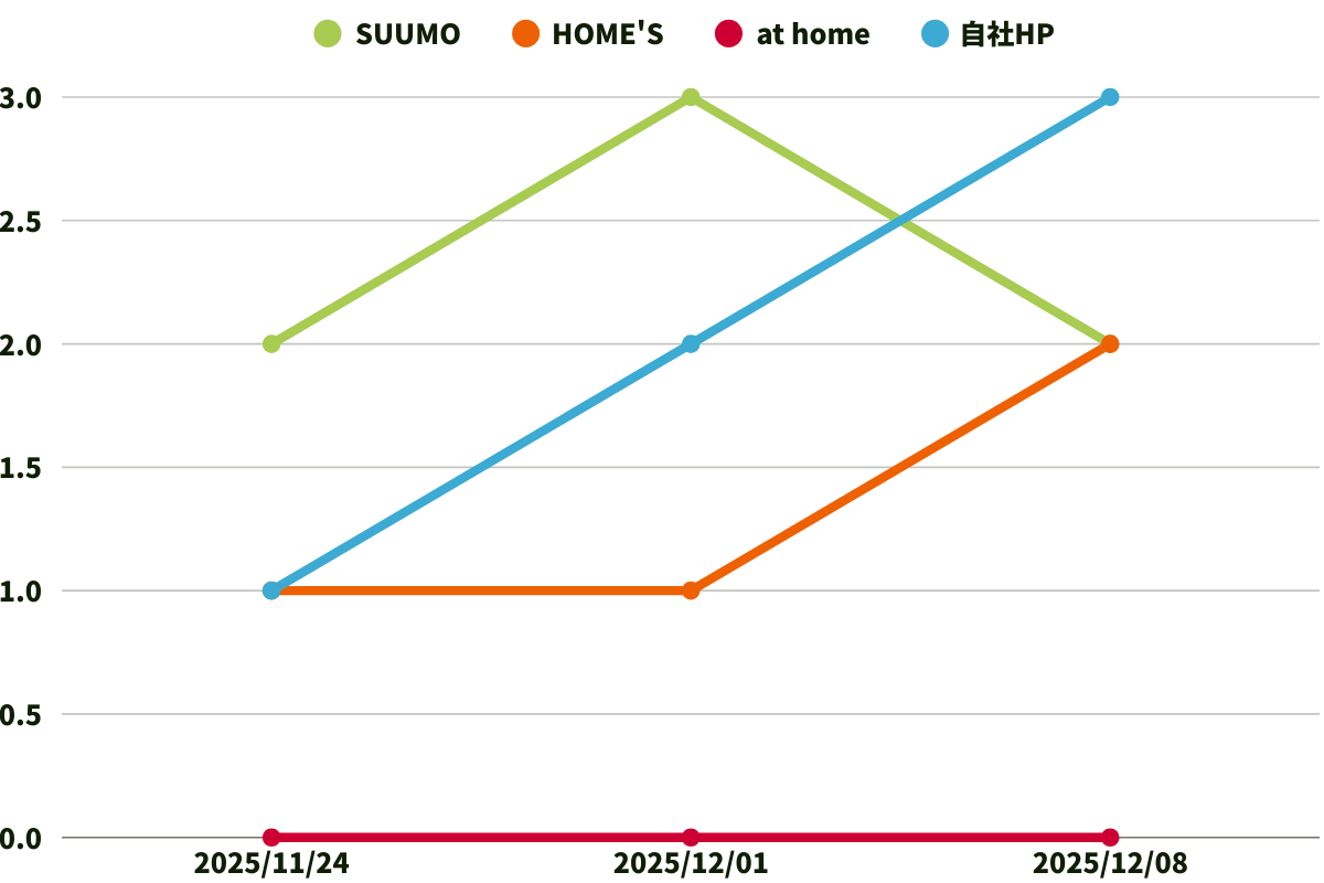 不動産会社からの問い合わせをもとに、レインズへの登録開始から売買契約完了時までに弊社が実際に目視にて確認した実際の広告掲載数をグラフにしております。